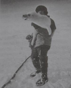 И вот для добычи зверя приходили вот к этому краю припая и наблюдали. Ну там зависело от ветра, от воды. И создавались так называемые разводья. То есть между льдом открытые участки воды. И в эти участки поднимались тюлени. Поднимали головы там. Все. У них сидели уже замаскированные стрелки. Им винтовки были выданы. И они все время наблюдали. Если зверя увидели, что зверь поднялся, они, значит, стреляли. Ну если попадали, убили, то этот зверь сразу всплывает. И вот надо было этого зверя достать на берег. Тут, вернее, на припай вытащить. А открытая вода. Вот эта лодка использовалась, для того, чтобы подъехать. Этого зверя, ну там, у нас называется кутилом, не кутилом зацепляли и подплавляли к бе… к припаю. Ну и вытаскивали.2)